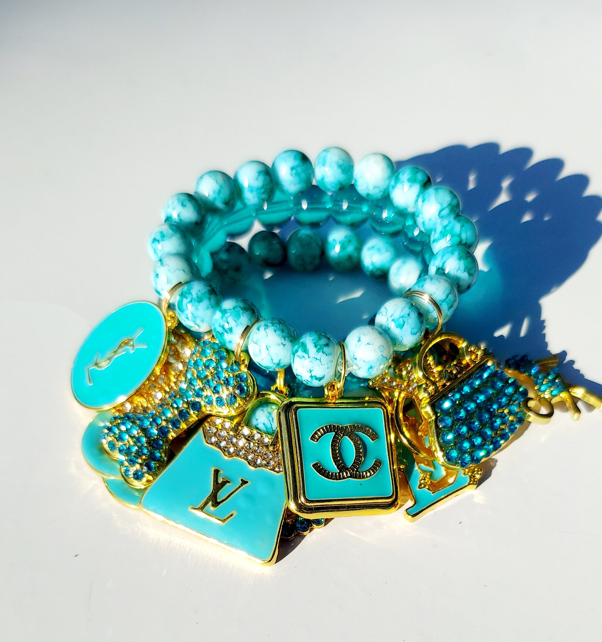 Stacked Beaded Charm Bracelets (Aqua/Gold)